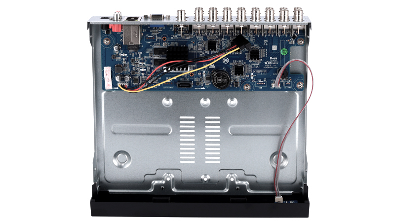 Grabador de 16 canales a 25 imágenes por segundo por canal. Con salidas de video HDMI y VGA. Capacidad para 1 disco duro SATA de hasta 6 TB. |